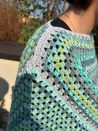Bellissima mantella realizzata a uncinetto con la tecnica granny square in tonalità verde acqua, grigio e lime. Il filato è morbido e leggero perfetto per la mezza stagione.