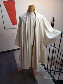 Mantella lunga in lana color avorio Fiorucci, anni '80, con profili in pelle. Perfetta e mai indossata.
