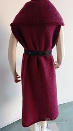 Metamorfosi di lane dal Casentino di Elisa Bellugi Un'architettura di filo tra sapienza artigiana e Alta Moda Questa creazione è un emblema del vintage alla moda e senza tempo, dove la purezza delle lane del Casentino incontra il design scultoreo di Elisa Bellugi. Un pezzo che non si limita a vestire, ma costruisce una silhouette regale e versatile. Non è un cappotto, ma una cappa-mantella trasformabile, caratterizzata da un’ampiezza generosa e avvolgente. Priva di bottoni, questa struttura invita alla personalizzazione: può essere segnata in vita da una bella cintura d'epoca o chiusa da una spilla d'archivio. La sua versatilità è tale che il grande collo sciallato può essere sollevato per diventare una cappa con cappuccio, trasformando il look da sofisticato a misterioso e protettivo, perfetto per le atmosfere della Costa Azzurra. Materia Prima: Eccellenza delle lane dal Casentino,e non solo mohair e cashmere. Un tessuto materico, caldo e vibrante nella sua tonalità magenta/bordò. Questo capo vanta una costruzione magistrale dove ogni estremità è definita. Le cuciture sono concentrate nel giro manica (che permette il passaggio delle braccia mantenendo la linea della mantella) e nel giro capo, interamente rifiniti con un bordo di lana in tinta contrastante che ne delinea l'architettura. L'assenza di maniche lunghe e bottoni permette una vestibilità fluida sopra ogni outfit, rendendolo un pezzo "couture" che esalta i gesti e gli accessori di chi lo indossa. Elisa Bellugi, Cavaliere del Lavoro e Grande Ufficiale, è stata una delle più grandi tessitrici del '900. Mentre in altre sue creazioni amava intrecciare fili d'oro e d'argento come gioielli tessili, in questo pezzo celebra la purezza assoluta della lana. La sua arte è stata amata dalle Sorelle Fendi e dalle Sorelle Fontana, e indossata da icone come Jacqueline Kennedy e Rita Levi Montalcini. Oggi, le sue opere prive di etichetta — perché "firmate" dalla trama stessa. NOTA: Sul mio profilo sono disponibili h