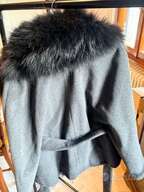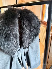 Elegante mantella con un collo in pelliccia sintetica nera e una cintura per chiuderla.