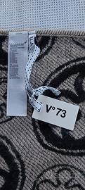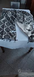 mantella reversibile in jacquard, da un lato personalizzata all over V°73, l'altro lato tinta unita beige. misure H145 L155. rifinita con frange.