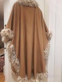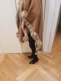 Splendida mantella in panno di lana con bordi di lince, color cammello. Originale vintage Yves Saint Laurent.