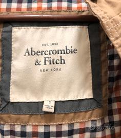 Cappotto originale Abercrombie & Fitch (con logo su fronte, etichette, bottoni). Accessorio molto elegante, con dettagli altamente rifiniti, che lo rendono molto bello esteticamente. Dotato di tasche anteriori con bottone. Dotato di chiusura con bottoni solidi e saldamente cuciti. Dotato di interno rivestito con fodera a scacchi. Dotato di spacco posteriore. Colore tortora scuro. Tessuto "stone washed". Adatto per estate o autunno. E' stato indossato una volta sola, è come nuovo, non presenta alcun difetto.
