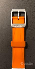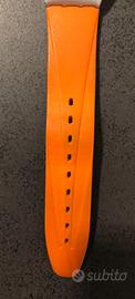 Orologio vintage (anteriore anni '80). Cinturino in gomma colore arancione fluo. Quadrante color argento, interno bianco con cronografo e datario. Profilo basso. Parte interna del cinturino ondulata. L'orologio si trova, malgrado la sua anzianità, in perfette condizioni. Non presenta nessun difetto, se non un piccolo annerimento in alcune parti del cinturino. Perfettamente funzionante. Si fornisce senza batteria.