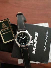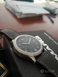 Nota casa di orologi Margi Ref. 7040 Movimento a carica manuale del famigerato calibro UNITAS 6497. Meccanismo molto apprezzato e montato su brand di alto prestigio! Cassa in acciaio da 42mm Ghiera in acciaio spolverato con contorni lucidi. Quadrante nero con lancette style khaki Secondiera dedicata come da tradizione ad ore 9. Full Luminor notturno Water resist 50m Perfettamente funzionante e preciso. Rintocchi dei secondi profondi,nitidi e puliti. Condizioni estetiche Eccellenti,da fondo di negozio,Mai polsato. Full set a corredo Garanzia timbrata e datata. Cinturino originale Fibbia originale Insomma Tutto originale! Rivolto a collezionisti conoscitori. Astenersi inutili perditempo. Si rende visibile e disponibile da Esclusiva Collezione Personale. ....guarda sempre il mio armadio!