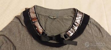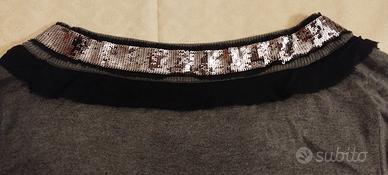 Questa è una maglia a maniche lunghe da donna grigia con scollo a paillettes. misure 47/64 cm