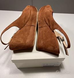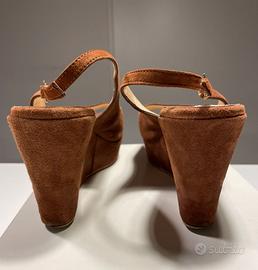 Marina Rinaldi – Sandalo di pelle scamosciata, colore Cognac – Tacco con zeppa e plateau - Taglia 38 (calzata comoda abbondante) – Cinturini con fibbia dorata lucida - Il marchio MR è inciso sulle fibbie, vedi dettaglio nelle foto (articolo distribuito da Diffusione Tessile s.r.l.-Internd, come è indicato sulla scatola). Suola di cuoio - Soletta interna di pelle.