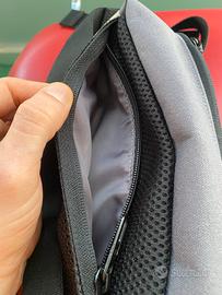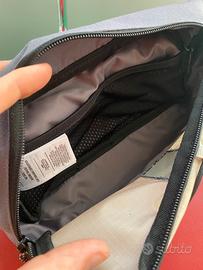 Dimensioni: 7 cm x 28 cm x 14 cm Esterno: 100% poliestere (riciclato); interno: 100% elastomero termoplastico Tasca anteriore e posteriore con zip Cinghia regolabile
