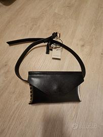 marsupio AllSaints, modello Studded Belt Bag, realizzato in pelle nera con dettagli borchiati.