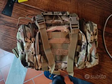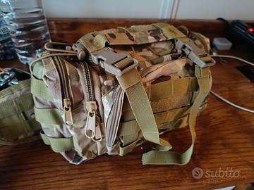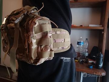 Marsupio tattico in fantasia mimetica, ideale per escursioni o attività all'aperto.