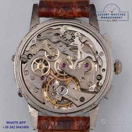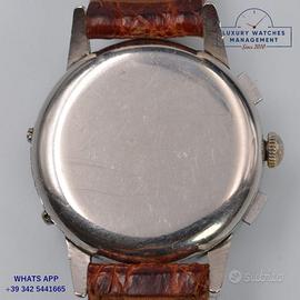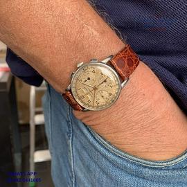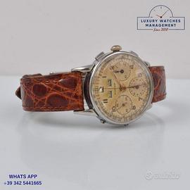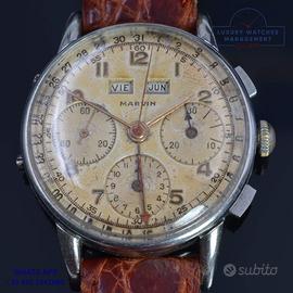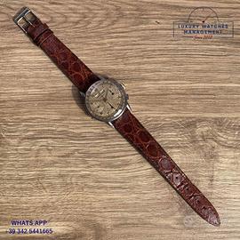 Marvin chronograph Dato Compax acciaio, anno di produzione circa 1950, vetro a cupola in plastica, quadrante tropicale colore avorio a tre contatori con calendario completo e scala telemetrica, movimento meccanico a carica manuale, cinturino alligatore colore marrone con fibbia in acciaio generica.
