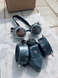 Set composto da maschera decorativa nera e argenta con filtri laterali e occhiali steampunk con lenti scure e punte metalliche. Perfetto per outfit post-apocalittici, cyberpunk, steampunk o industrial. Ideale per feste a tema, cosplay, spettacoli, LARP o shooting fotografici.