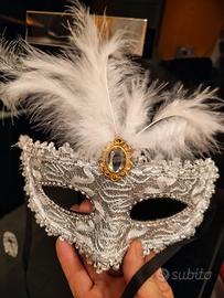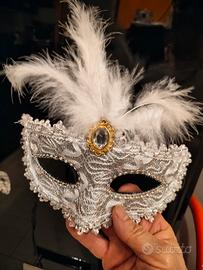 Splendida maschera a metà viso in stile veneziano, perfetta per balli in maschera, Carnevale, feste a tema, Halloween o addio al nubilato. La maschera è realizzata con una base rigida rivestita in pregiato pizzo bianco lavorato e arricchita da dettagli scintillanti:
