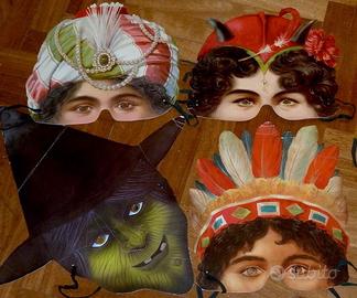 Perfette per Carnevale, Halloween o feste in maschera. Realizzate su modello di maschere vittoriane, ognuna è mezza maschera a grandezza naturale con lacci di cotone e fori per gli occhi. Queste maschere venivano indossate alle feste e balli mascherati, e altri eventi sociali nel tardo '800 e l'inizio del '900. L'una €7 - prezzo speciale per acquisto in blocco.