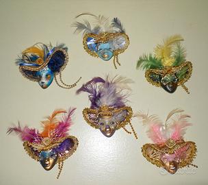 Vendo mascherine Veneziane con calamita/magnete e un occhiello per appenderle. Tutte le mascherine sono NUOVE, Mai usate, fatte a mano e acquistate direttamente e personalmente in un laboratorio artigianale a Venezia; altezza mascherine 6/8 cm circa. Il prezzo per ogni mascherina è di 6,00€ cadauna (pagate 12,00€ l'una), ma se acquistate l'intero lotto di 6 maschere il prezzo è 30,00€ (una è in omaggio).