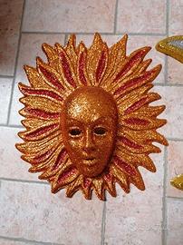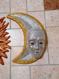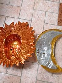 Due maschere carnevale, Sole e Luna. Si possono indossare ma sono molto belle anche appese come ornamento. Misure del Sole alto cm.50 largo cm.40 Misure della Luna alta cm.45 larga cm.35
