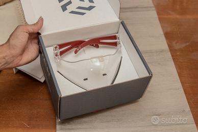 Sicuro: ignifuga e non tossica Sostenibile: ecologico grazie ai molteplici utilizzi; Materiale riciclabile al 100% (policarbonato) Pratico: le staffe colorate delle aste possono essere sostituite in pochi secondi senza bisogno di attrezzi (clip-on) Comodo: super confortevole, leggero (53 g), indossa come occhiali da vista, nessuna sensazione di soffocamento, può essere indossato anche con occhiali da vista.