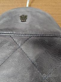Giacchetto modello bomber in pelle imbottito, motivo trapuntato colore dèlavé blue jeans, doppia chiusura cerniera e bottoni di Massimo Dutti.