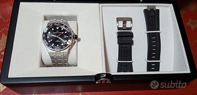 Full Set con box e libretto originale, con doppio cinturino (uno in acciaio inossidabile e l’altro in caucciù nero, entrambi con sistema di cambio rapido).