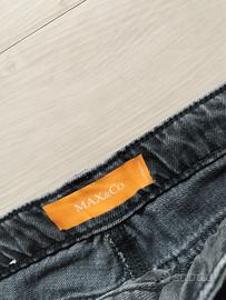 - pantaloni in denim marca Max & co, taglia 29. Vita media gamba taglio carota, non aderente. Effetto "vissuto" con strappi ed usure (lo strappo grande sulla coscia é rivestito). Ha un occhiello della patta rotto -vedi foto.