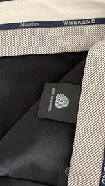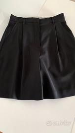 Bermuda dalla linea morbida e svasata realizzato in tela di pura lana con passanti e pieghe cucite in vita, tasche alla francese sui fianchi e a filetto con bottone sul retro, allacciatura nascosta tramite zip, bottone e gancio.