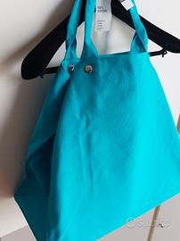 Maxi shopper mare OVS, tessuto 100% cotone, due manici, tasca interna con cerniera, chiusura con bottoni automatici, fondo rimovibile. Larghezza 43,5 cm; altezza 36 cm; profondità 22,5. NUOVA CON CARTELLINO.