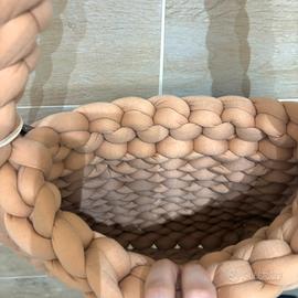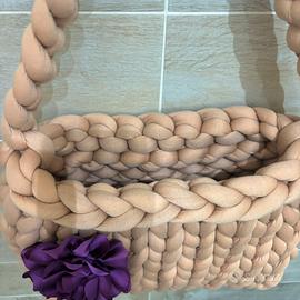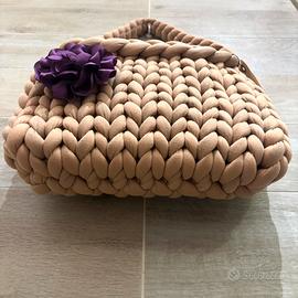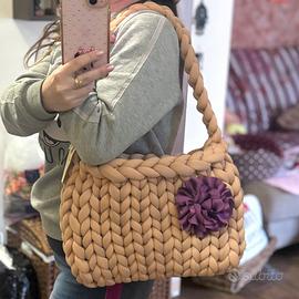 Pezzo da esposizione fiera. Vendo maxi CHUNKY BAG color nocciola 🤎con fiore in raso color violetto 💜 (il fiore si può rimuovere e può essere utilizzato come spilla o come fermaglio per capelli) La borsa si porta a spalla ed è capiente . Realizzata a mano da me con filato marshmallow in poliestere “effetto cotone” Misure: 36 cm x 25 cm
