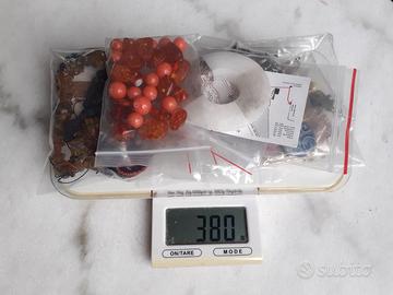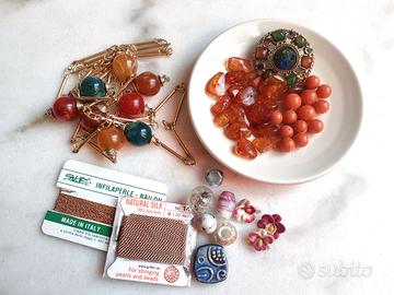 Per cessata attività vendo in blocco circa 400 grammi materiale di alta qualità per fabbricazione monili: collane bracciali, orecchini eccetera. Fai da te, DIY Perline / ciondoli di pietra, ambra del Baltico, ambra messicana del Chiapas, lava naturale nera, giada rosa, madreperla, ematite, alabastro, radice di smeraldo, pietra del sole, corniola, vetro artistico a mano, ceramica raku, madreperla, argilla polimerica. MOLTISSIMO materiale fatto a mano /lavorato artigianalmente componenti diversi: ciondoli, charm e chiusure per collane di argento, acciaio lucidato a specchio, acciaio, argentati, placcati argento, ceramica, bronzo, connettori per orecchini e collane a cerchio e a stella filo infilaperle speciale per AMBRA in nylon e in seta pura gioielleria vintage da utilizzare così com’è o per upcycling, smontandola per recuperare i bei materiali: - bracciale rigido in ottone - anello regolabile coordinato con inserti in pietra o smalto - pendente in madreperla e perline rosse - collana doppia bar link chain modernista, Mid-century-modern, anni 60-70, perle di resina o bachelite o lucite - spilla americana vintage anni 50-60, da trasformare magari in ciondolo, metallo dorato filigrana pietre resina /lucite , marchiata SC (Sarah Coventry?) REGALO altri componenti a seconda della disponibilità fra le rimanenze (vedi ultima foto componenti ottone, charms, catene Chiedi pure altre foto dei particolari o informazioni SOLO SPEDIZIONE NO RITIRO A MANO #gioiellivintage #bigiotteriavintage #ambrabaltica #giadanaturale #perlineceramica #componentigioielli #perlepercollane #upcycling #materialicreativi #charm #chiusureargento #lottociondoli #madreperla #pietredure #hoops #pendentiorecchini