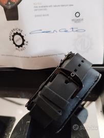 Serie limitata 250 esemplari, set completo, estratto datato febbraio 2025, cassa in titanio dal diametro 44 mm per uno spessore di 15, automatico svizzero Eta Valjoux calibro 7750.