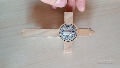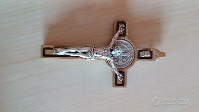 Crocifisso di San Benedetto in metallo color argento e croce in legno, con corpo di Cristo e medaglia del Santo in metallo argentato, finemente lavorato e curato nei dettagli. Benedetto da frate Cherubino. Altezza 10 cm. Nuovo, estratto dalla custodia solo per scattare le fotografie.