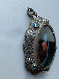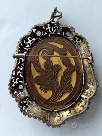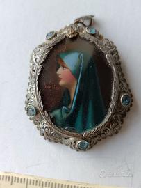 Un magnifico medaglione antico di manifattura italiana anni 1930-1940 in argento o metallo argentato e pietre semipreziose. Il medaglione, realizzato in filigrana, contiene l’immagine di una giovane Madonna di profilo. Il gioiello può essere indossato anche come spilla. È un magnifico regalo per una comunione o cresima, di grande rarità e molto ben conservato.