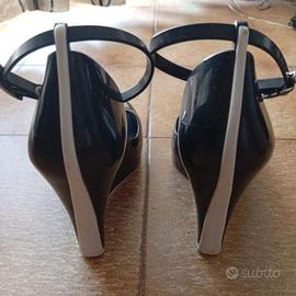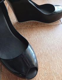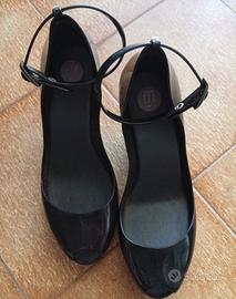 Si tratta di un sandalo plateau Jelly Black a punta aperta con cinturino alla caviglia, appartenente alla linea classica dei "heel" (tacchi) o zeppe del brand. Materiale: Realizzate interamente in Melflex, un tipo di PVC speciale brevettato, flessibile, ipoallergenico e riciclabile al 100%. Hanno il tipico profumo di gomma da masticare (bubblegum). Cinturino sottile regolabile alla caviglia con fibbia. Soletta interna imbottita per un maggiore comfort. Punta tonda aperta leggermente a mandorla. Nuove Misure in foto No confezione