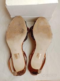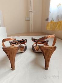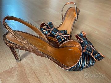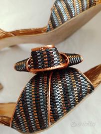 MELLOW YELLOW sandali con cinturino posteriore con elastico, scarpe slingback open toe n.38, Made in Spain, tomaia e tacco ricoperto in tessuto color rame, con fiocco in tessuto multicolore (rame, marrone, azzurro, blu), n.38, fodera e sottopiede in vera pelle.