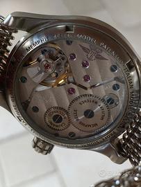 Fondo cassa a vite squelette dotato di vetro zaffiro per consentire la visione del movimento. Contatore dei secondi ad ore 9. Impermeabilità 20 atm comunque da testare. Cinturino in acciaio shark mesh da 22mm e uno in gomma mimetica in alternativa cinturino gomma nero della Memphis Belle. Ghiera girevole con scala graduata incisa.