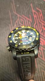 Quadrante nero opaco con indici 'applique' fluorescenti e logo e indici minuti gialli in rilievo. Datario speciale. Lancette gialle scheletrate luminescenti.