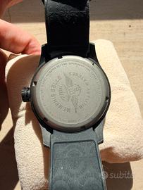 Ansa fissa passante, 30kg allo strappo. Fondo cassa in titanio grado 2 amagnetico serrato a vite. Corona a vite con logo in rilievo con doppio o-ring di sicurezza. Ghiera girevole unidirezionale monopezzo con scala graduata incisa. Vetro zaffiro 1000 Vickers antigraffio flat, con trattamento antiriflesso. Impermeabilità 200m. Movimento Quarzo ronda Cal. 517 Swiss Made. Quadrante nero, con indici, numeri arabi e lancette fluorescenti con trizio. Datario. Cinturino integrato in gomma siliconica.