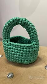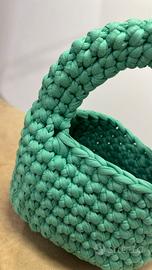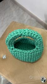 Mini borsa artigianale intrecciata a mano color verde menta. Compatta ma capiente per essenziali (telefono, chiavi, portafoglio). Manico morbido e struttura resistente. Perfetta per uso quotidiano o occasioni casual. Pezzo unico handmade, in ottime condizioni.