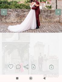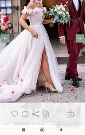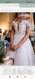Romantico e femminile abito a linee con profonda scollatura a v e spalline omerali con rose 3D sfumate bianche e rosa...la gonna è in tulle sempre rosa con uno spacco alto...ho fatto aggiungere uno strato di glitter a grana grossa per un effetto scenografico ma sempre raffinato ed elegante...l abito ha una lunga coda... è stato igienizzato in lavanderia dopo l uso ( il collarino è compreso con l abito e lo rende ancora più particolare)