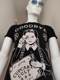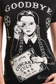 Wednesday Addams è una delle maggiori ispirazioni per le ragazze Goth e le streghe di tutto il Mondo! Interpretata da una giovanissima Christina Ricci nella versione cinematografica de "La Famiglia Addams", la riconosciamo dal primo sguardo. Su questa splendida maglietta nera rende omaggio alla gotica Mercoledì. Su uno sfondo scuro la ragazzina la ragazzina con le trecce tiene un monocolo all' occhio e una tavola ouija, tavola spirituale sul quale si legge "cupcake cult 666". Notevoli sono anche i simboli esoterici come i pentacoli e le croce rovesciate. Questo magnifico modello a maniche corte è stato realizzato in cotone di alta qualità . È disponibile in Taglia Large. Originale e Super stiloso piacerà alle comunità alternative, agli appassionati di cinema e agli appassionati dell' estetica molto oscura che emana da questo Outfit. Il marchio CupCake Cult ti propone un Top Dark perfetto per ogni circostanza.