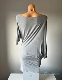 Mini abito asimmetrico grigio con maniche a “pipistrello”. Tessuto elasticizzato con lustrini argento. Composizione:
