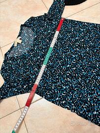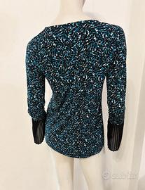 Maglia blu azzurra e nera a fantasia foglie, dettagli in tessuto nero plissettato nei polsini. MICHAEL KORS, taglia S, le misure in cm sono riportate in foto, condizioni ottime. Contattatemi per acquisti in lotto. Contattatemi per ulteriori informazioni.