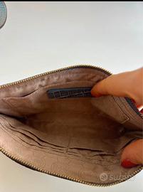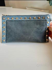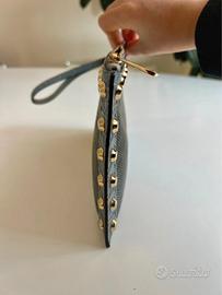 Pochette originale Michael Kors in tessuto effetto denim blu con profilature in pelle stampa pitone azzurro e borchie dorate.