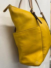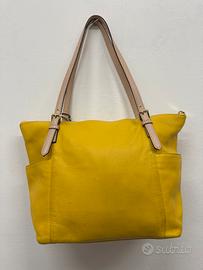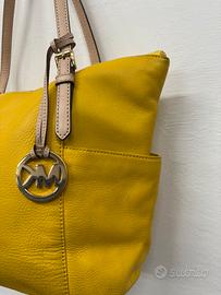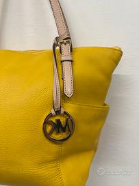 Borsa di pelle gialla con manici color pesca ed intarsi a cintura color dorato pendolo con logo M K perfettamente in buonissime condizioni
