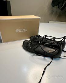 Design minimalista e moderno con sottili lacci da avvolgere alla caviglia o alla gamba, suola piatta in gomma con logo ‘’MK’’ e plantare imbottito per un comfort ottimale.