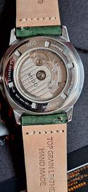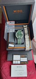 Mido Collezione Commander - Ref. M021.626.11.091.00 – IMPERMEABILITÀ 5 bar (50 m / 165 ft) - PESO (G) 141 – CASSA Rotonda in Acciaio inossidabile da 42x42mm – Spessore medio 12mm – Quadrante verde soleil con indici – vetro zaffiro – fondello a vista - MOVIMENTO MIDO automatico ETA Riserva di carica pari a 80 ore spirale Nivachron™. L'innovativa lega di metallo a base di titanio riduce le interferenze magnetiche e offre una grande resistenza agli urti e all'usura. – FUNZIONI Grande data – Cinturino in Acciaio inossidabile più cinturino pelle su tono nuovo