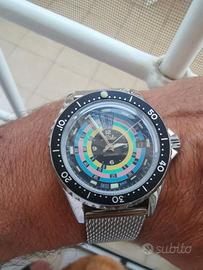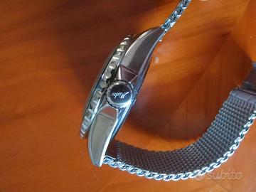 e' fornito con 1 cinturino in pelle e 1 in tessuto entrambi con cuciture gialle e chiusura ad artiglione in acciaio, mai utilizzati!