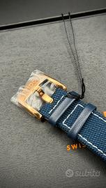 Cinturino in tessuto blu con chiusura ad ardiglione, leggero e confortevole al polso.