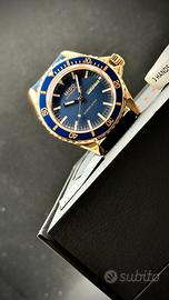 Cassa in acciaio inox con elegante finitura color oro, diametro 41 mm, spessore 13 mm, vetro zaffiro antigraffio.