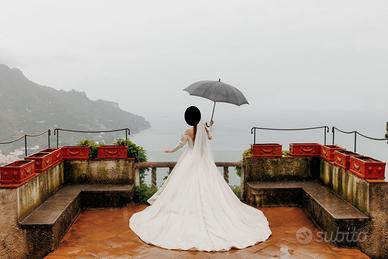 Milla Nova, Royal collection, ZAHA Colore: Ivory Silhouette: Principessa Taglia: M Delicato abito da sposa stile principessa in satin color avorio, con spalle scoperte. Presenta una profonda scollatura con strass a forma di cuore, maniche lunghe drappeggiate, con un lungo strascico e un'apertura con bottoni sul retro. Questo modello di abito da sposa è magnifico, splendido, affascinante. È un abito da sposa che incanta l’anima. Esprime grazia e nobiltà. Per altri detagli contattatemi in privato. Non si effettuano spedizioni