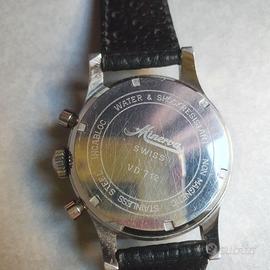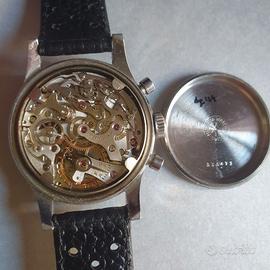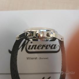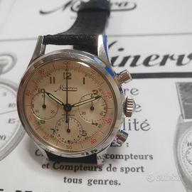 Vendo splendido e raro vintage cronografo MINERVA tri-compax in acciaio, a carica manuale, tasti ovvero pulsanti a pompa. Monta il raffinato calibro crono con ruota a colonne Valjoux 72. Si tratta di uno degli storici movimenti chrono a carica manuale quali il Lemania 2310, l'Angelus 215, lo Zenith 146, il Longines 13ZN, l'Excelsior Park EP4, l'Universal Genève 285. Ed è annoverato per la sua alta archittettura costruttiva. Cassa di misura 36 mm. corona esclusa. Fondello a vite marchiato. Quadrante originale a due colori. Secondo fonti d’epoca, modelli analoghi furono impiegati dalla Marina Militare svedese. L'orologio è originale e autentico. Il cinturino in foto è esemplificativo e non è incluso. L'orologio è stato revisionato recentemente da orologiaio professionista indipendente ed è in perfetto ordine di marcia. Massima serietà, prego astenersi perditempo. Valuto eventuale scambio con Omega Speedmaster Moonwatch 3861 co-axial zaffiro, Breitling Navitimer e Premier 777, Heuer Carrera 2447 e 3647 e Autavia 2446 e 3646 e Longines 30CH ref. 6474.